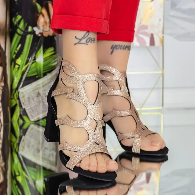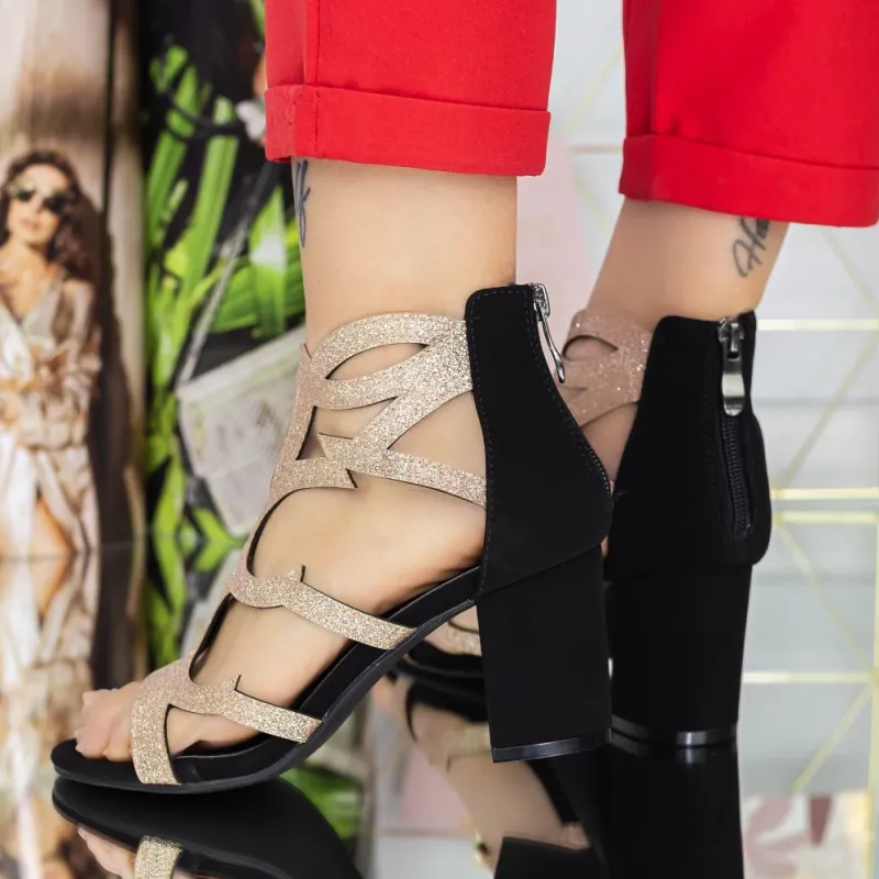 Sandale Dama cu Toc Gros XKK568 Negru-Champagne Mei